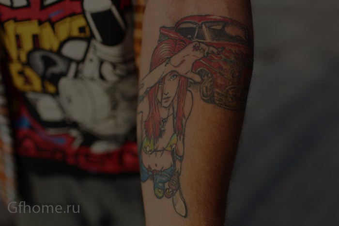 Эту татуировку сделал он же 4 месяца назад. Я всегда хотел себе какую-то женщину нататуировать. У меня на компьюторе более 3000 рисунков собрано, и из них была выбран этот. Эта моя тату с девушкой отражает мою любовь к машинам, девушкам и экстремальному спорту, потому что девушка держит доску от скейта и сама в татуировках.